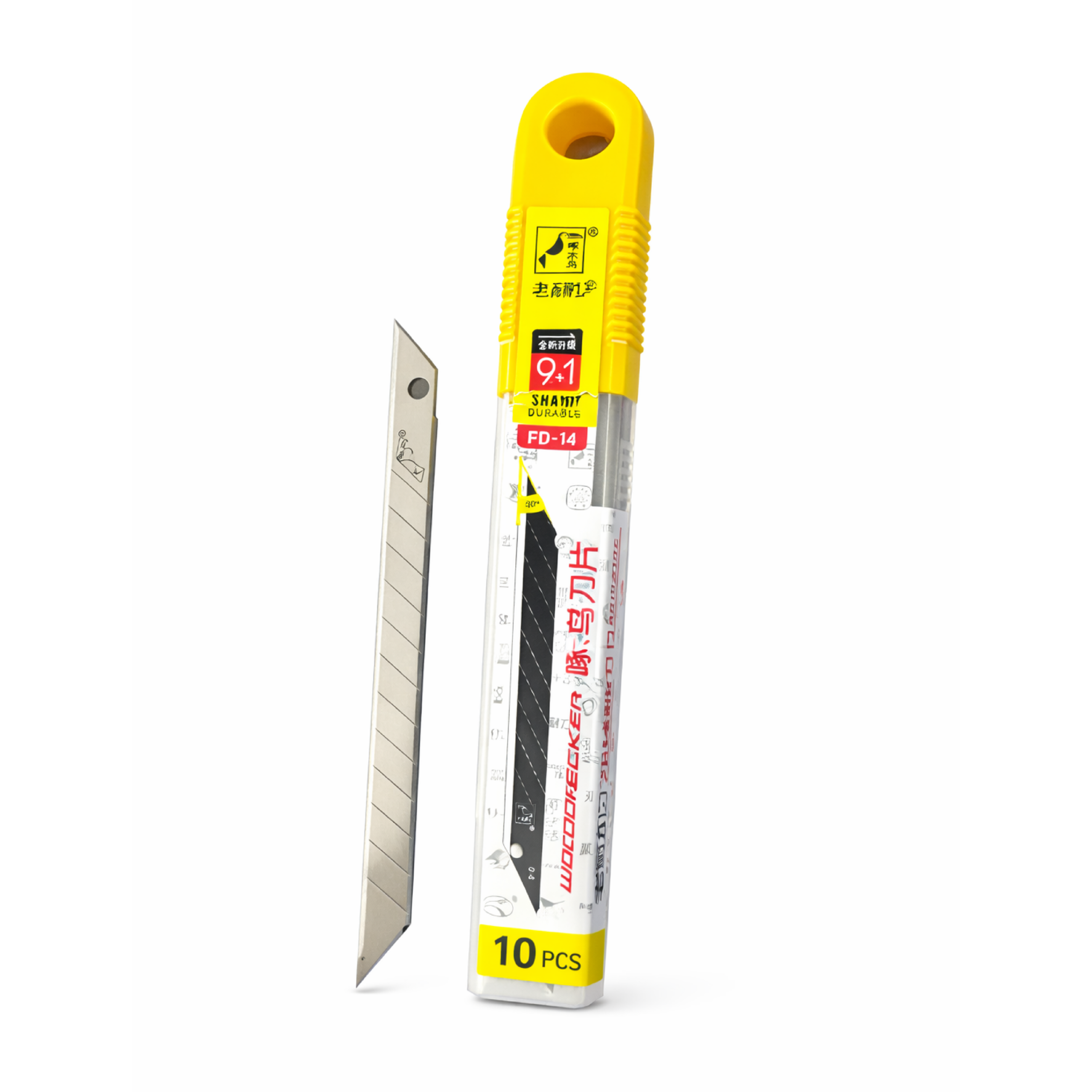 Zestaw zawiera 10 sztuk ostrzy (opakowanie Woodpecker / FD-14) — przeznaczonych do większości standardowych nożyków segmentowych 9 mm.